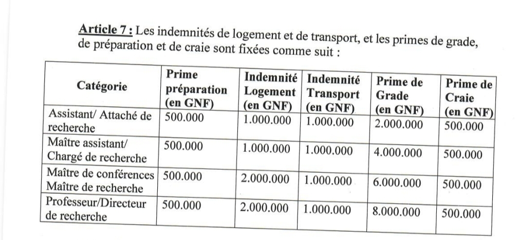 Article 13 : « La prime de risque s’élève à un million de francs guinéens (1.000.000 GNF) par mois. Elle est versée aux fonctionnaires titulaires des grades susmentionnés qui travaillent dans les ateliers ou les laboratoires à risque. »