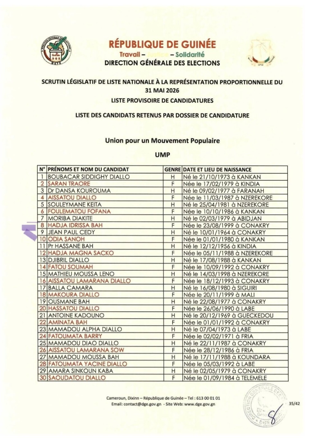 Parmi les personnalités retenues sur la liste nationale du parti Union pour un mouvement populaire (UMP), figurent Dr Dansa Kourouma, président du Conseil national de la transition (CNT), Jean Paul Cedy, ancien ministre de l’Éducation nationale, ainsi que Hadja Idrissa Bah, ancienne présidente du Club des jeunes filles leaders de Guinée.