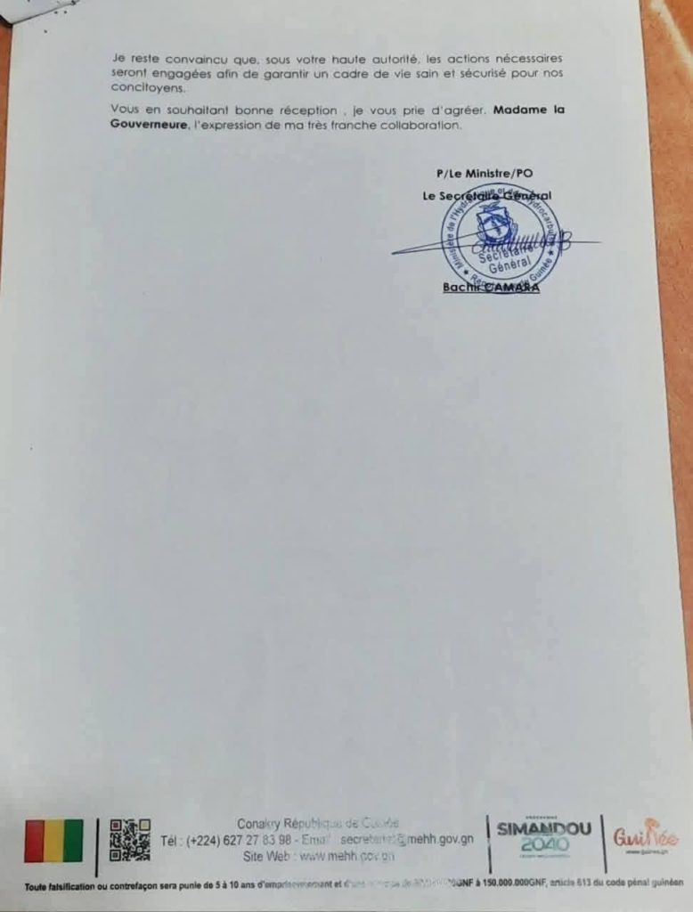 Dans un courrier officiel adressé à la Gouverneure de la Ville de Conakry, le ministère fait état d’une situation jugée préoccupante : dans plusieurs concessions, les canaux de drainage des eaux usées se déversent directement sur la chaussée et les voies publiques. Une pratique qui entraîne, selon le département, de graves conséquences, notamment l’insalubrité chronique, la dégradation accélérée des infrastructures routières et des risques sanitaires majeurs pour les populations.