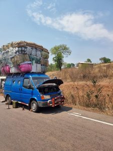 Le véhicule que l’on voit là, à l’image, est la parfaite illustration de ce que nous disons. Il est surchargé, dès le départ et le voilà qui tombe en panne, en chemin. Cric levé, capot ouvert !