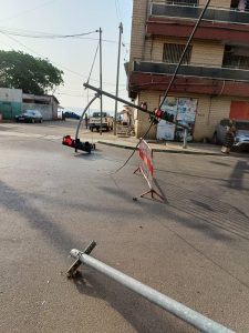C’est 16 février dernier, que les feux tricolores placés au carrefour Tombo, se sont éteints, lorsqu’un camion porte char, transportant des machines pour une société de la place et roulant de nuit, vers le Palais, a arraché́ les câbles des feux sémaphoriques. L’incident a causé́ de sérieux dommages à l’infrastructure. L’accrochage des câbles a entraîné la chute de deux poteaux du dispositif de signalisation, juste à l’intersection de Tombo. Ce qui a affecté les feux tricolores et les a mis hors d’état de fonctionnement.