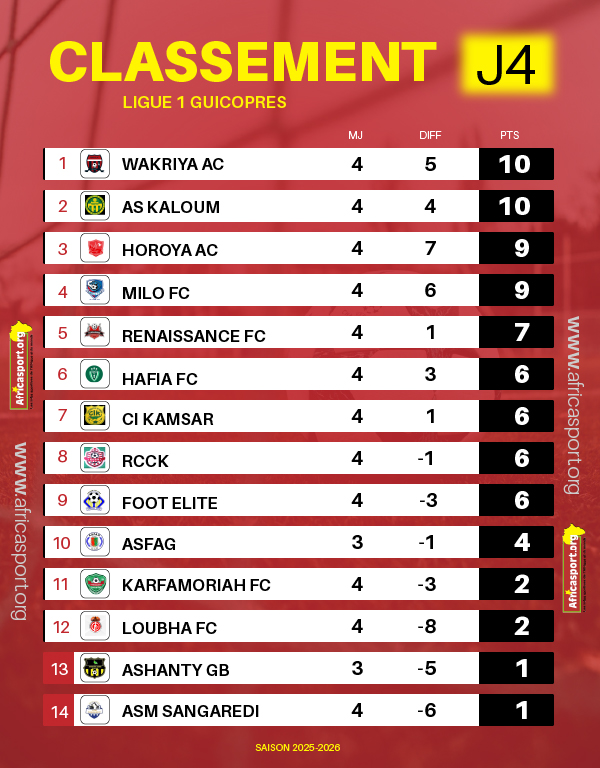 Au classement, le Wakriya AC et l’AS Kaloum mènent la danse avec 10 points chacun. La SAG de Siguiri et l’ASM Sangarédi ferment la marche avec un seul point.