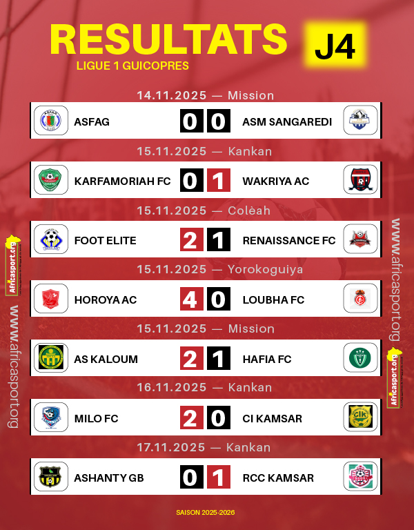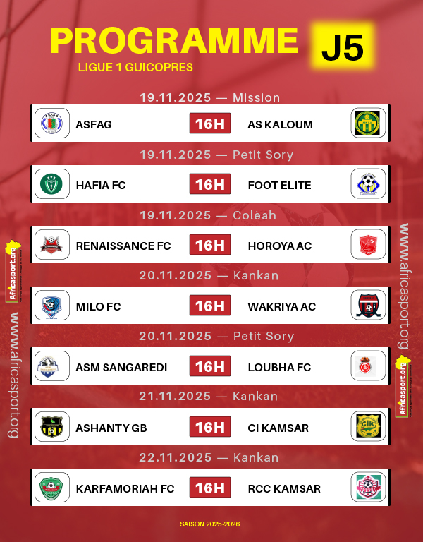 La 5e journée débutera ce mercredi 19 novembre. En ouverture, trois rencontres sont programmées : l’ASFAG accueillera l’AS Kaloum au stade de la Mission ; le Hafia FC tentera de se relancer devant Guinée Foot Élite ; pendant que le duel Renaissance FC–Horoya AC aura lieu au stade de Coléah.